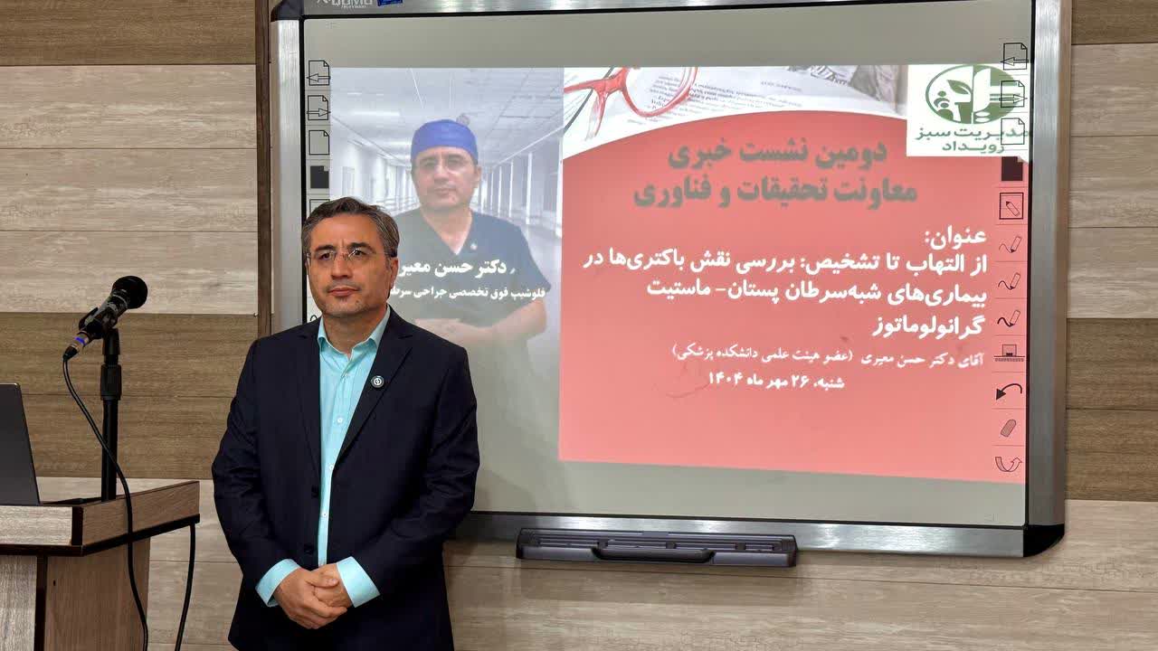 💢 دومین نشست خبری (ارائه نتایج مطالعات به ذینفعان) با عنوان «از التهاب تا تشخیص: بررسی نقش باکتری‌ها در بیماری‌های شبه‌سرطان پستان- ماستیت گرانولوماتوز» 👤 سخنران: جناب آقای دکتر حسن معیری عضو محترم هیئت علمی دانشکده پزشکی 📆 تاریخ برگزاری: شنبه ۲۶ مهرماه ۱۴۰۴ ⏰ زمان برگزاری: ساعت ۱۱:۳۰ الی ۱۳ 🏢 محل برگزاری: دانشکده پزشکی، سالن شهید رستم پور 📌 از کلیه اعضای محترم هیئت علمی، پژوهشگران، همکاران و دانشجویان گرامی دعوت می شود در این جلسه شرکت نمایند. 🧾برای شرکت کنندگان گواهی صادر خواهد شد.
